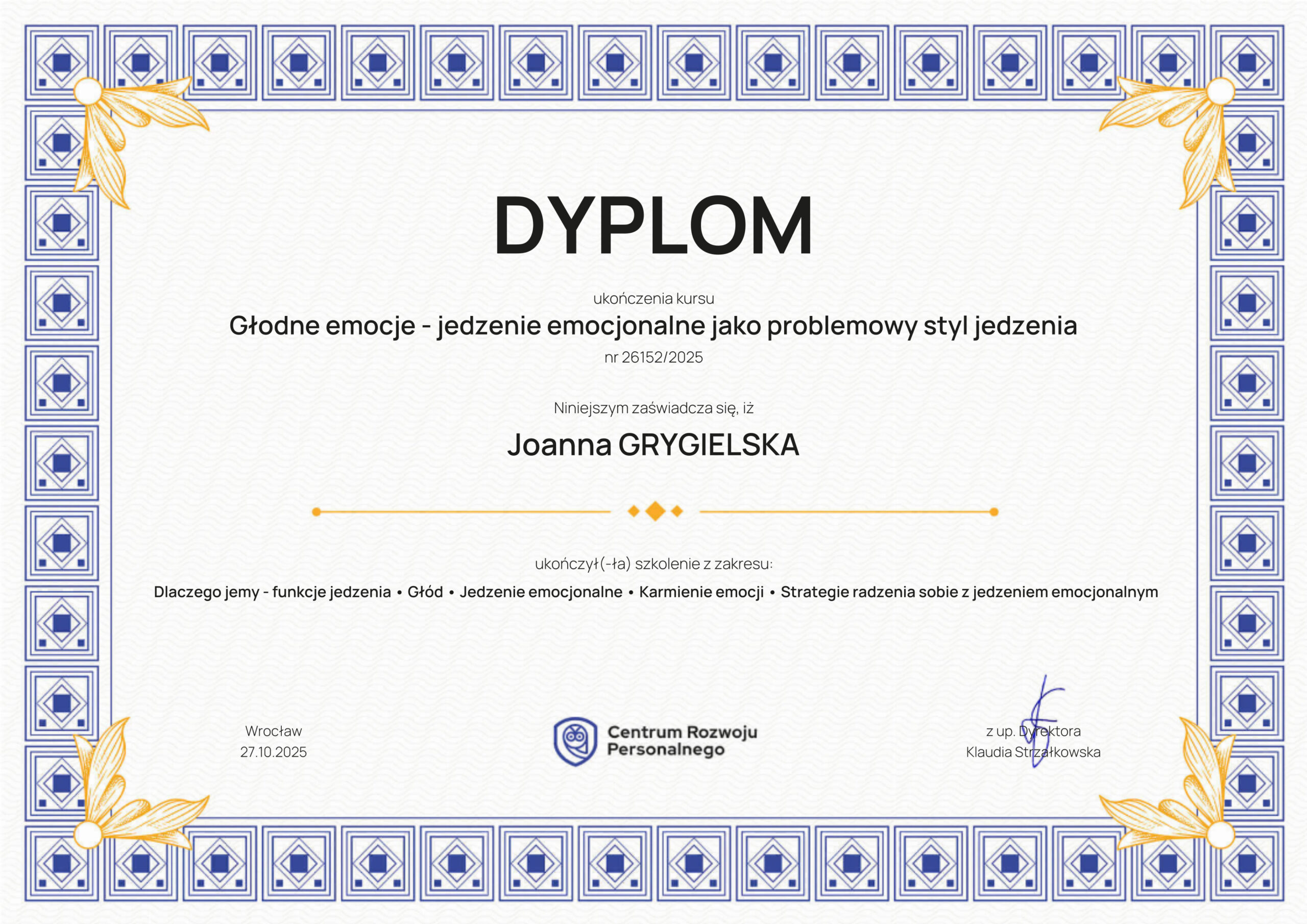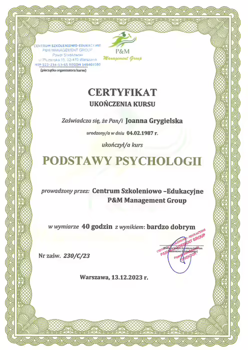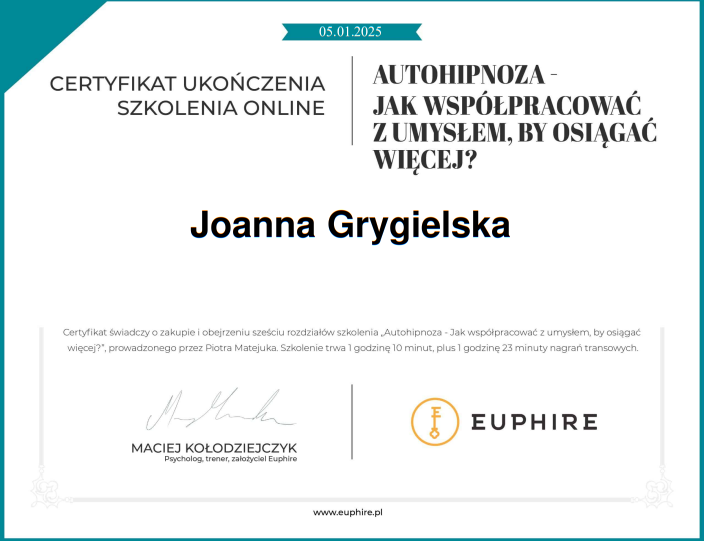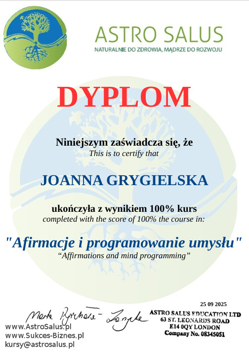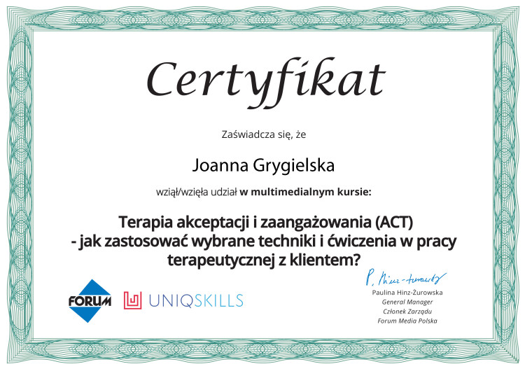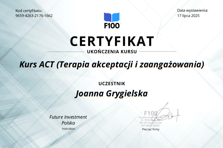 Podstawy psychologiiMentoring pewności siebie Terapia Akceptacji i Zaangażowania ACTACT techniki i ćwiczeniaZarządzanie emocjamiMindfulnessPoziomy świadomościKraina snówAfirmacje i Programowanie umysłuPsychosomatyka – relacja z ciałem w ujęciu terapeutycznymGłodne emocje – jedzenie emocjonalne jako problemowy styl jedzenia